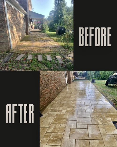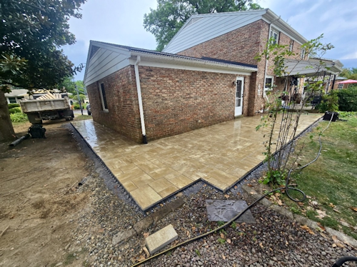 Once the foundation was set, the new patio began to take shape. The homeowners chose warm-toned materials that instantly brightened the home’s exterior. Beyond just replacing what was there, the design expanded to include a walkway that wraps around the side of the house. This addition ties the space together, making it not just a patio but a functional part of the home’s landscape design.